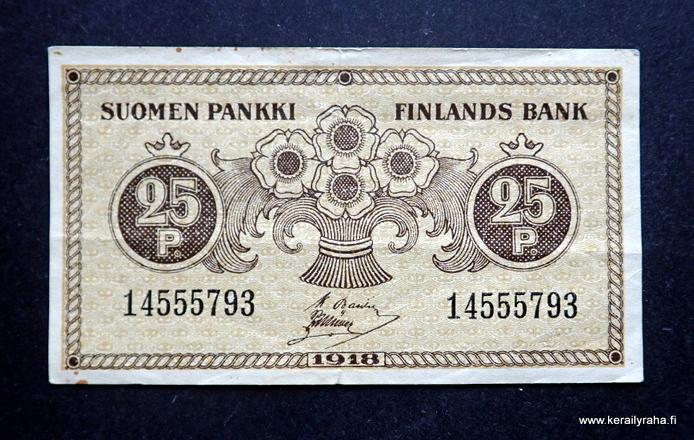 25 Penniä 1918 no 14555793 kl.4 repeämä n. 2 mm