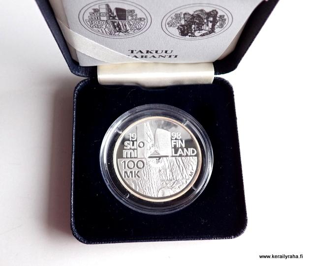 100 Markkaa 1998 Alvar Aalto (22 g = 925H) PROOF Kapselissa ja alkuperäisessä rasiassa