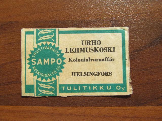 TT Etiketti Helsinki Urho Lehmuskoski (ruotsinkielinen) Tulitikku Oy Sampo Vihreä