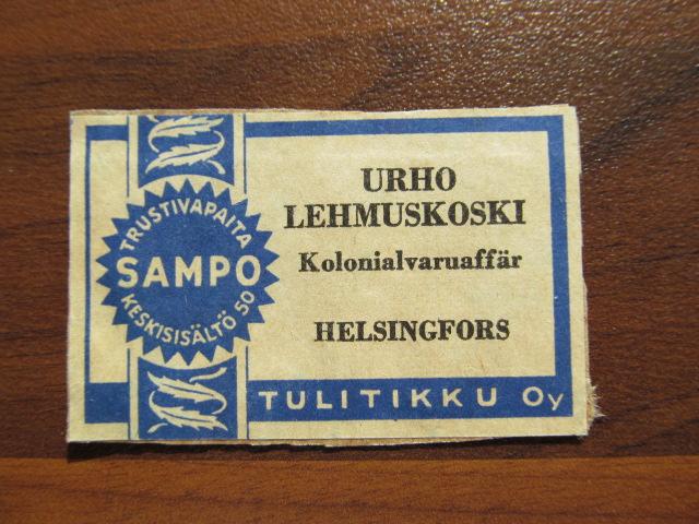 TT Etiketti Helsinki Urho Lehmuskoski (ruotsinkielinen) Tulitikku Oy Sampo Sininen