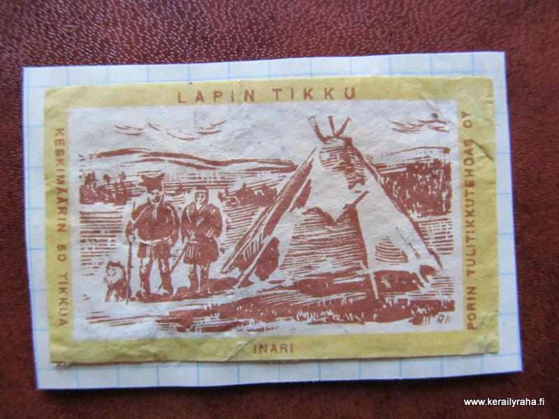 TT Etiketti Lapin tikku Inari Porin Tulitikkutehdas kuvallinen