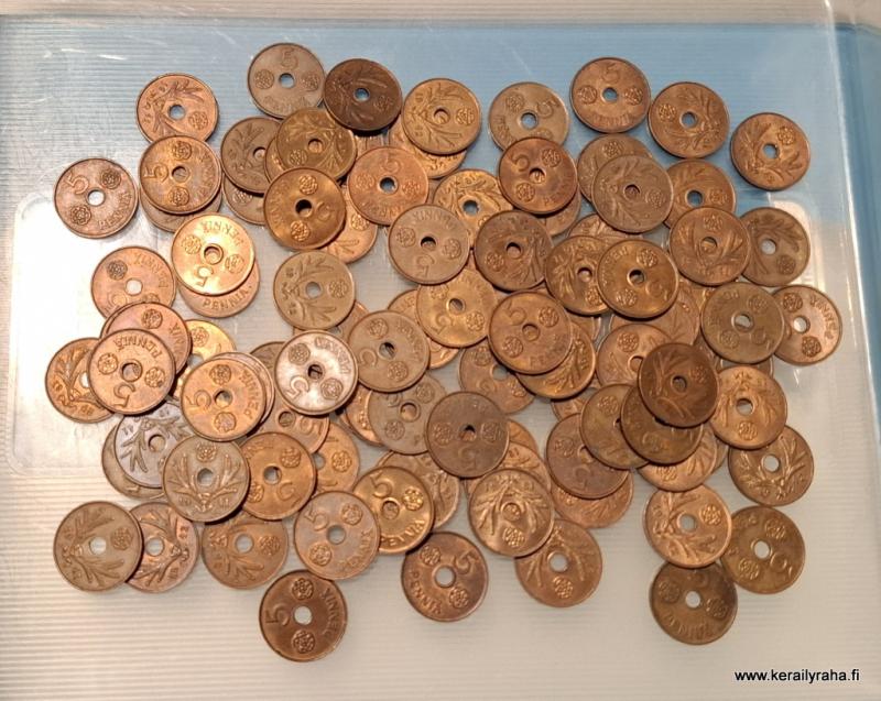 5 penni malli 1941-43 Cu pussi 100 kpl Vaihteleva kunto, keskim. kl.4-6